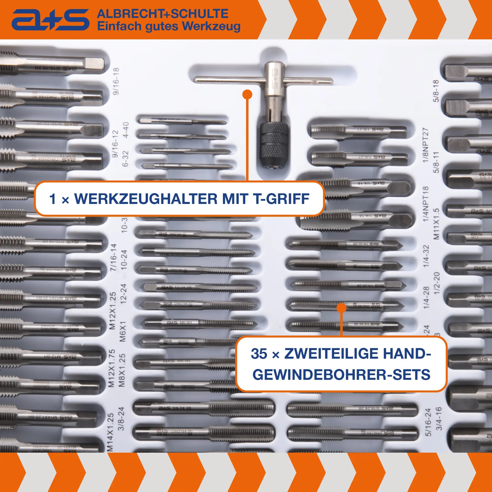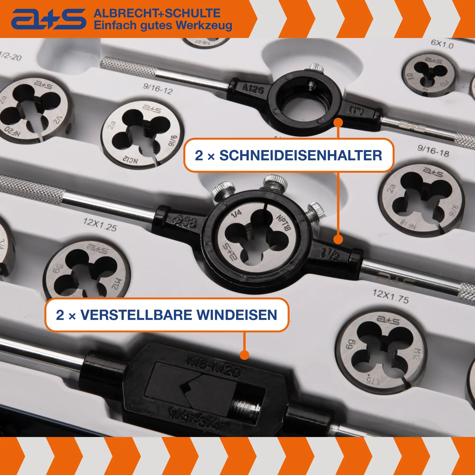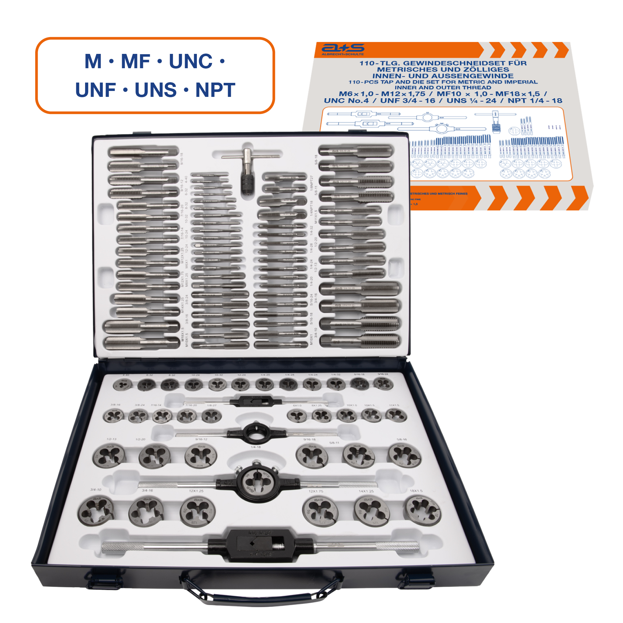Dieses umfangreiche a+s Universal-Gewindeschneider-Set ist die ideale Lösung für Werkstätten, die mit unterschiedlichen Gewindestandards arbeiten.