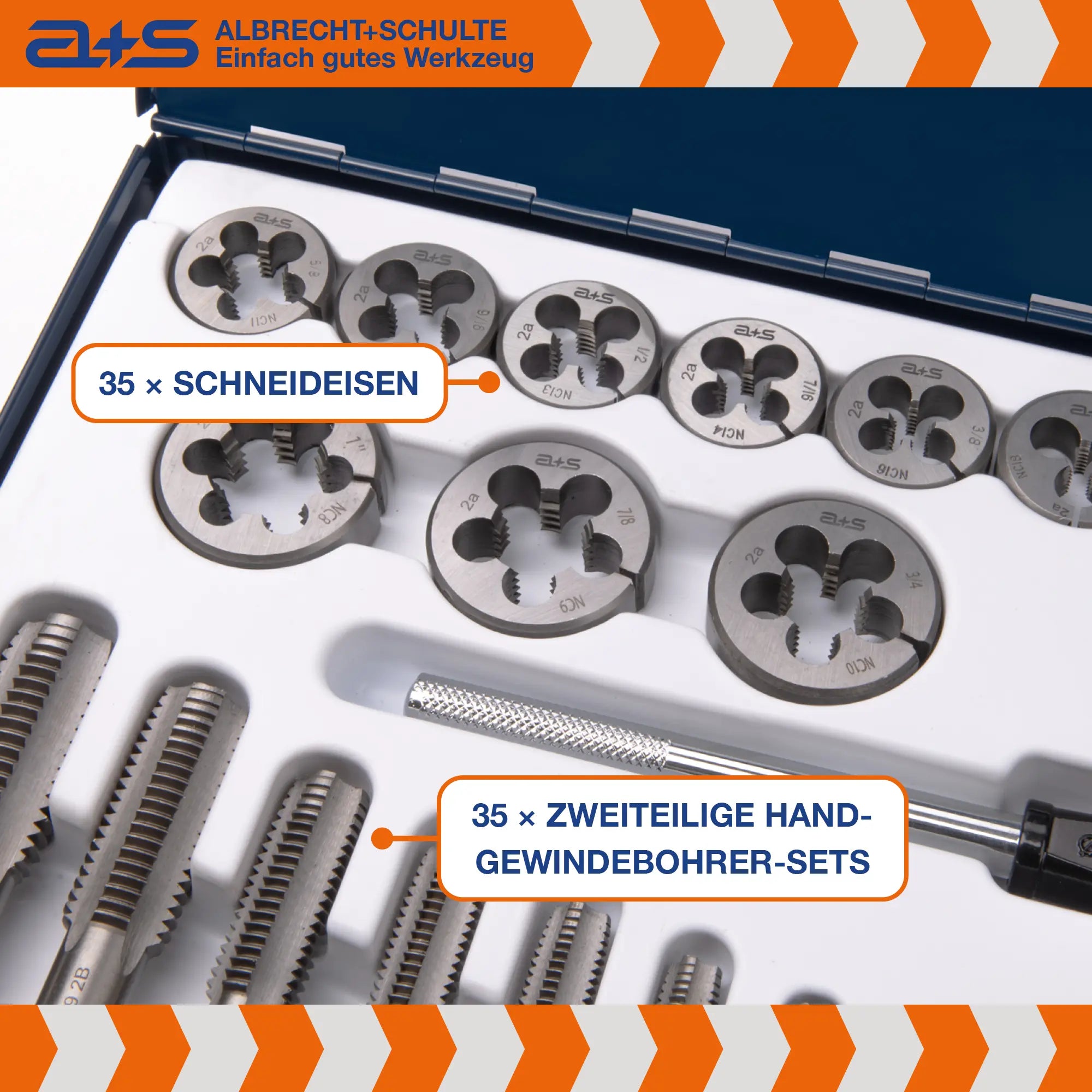 Alle Schneidwerkzeuge sind aus hochwertigem HSS-Stahl gefertigt und präzisionsgeschliffen für saubere, passgenaue Gewinde mit hoher Standzeit.