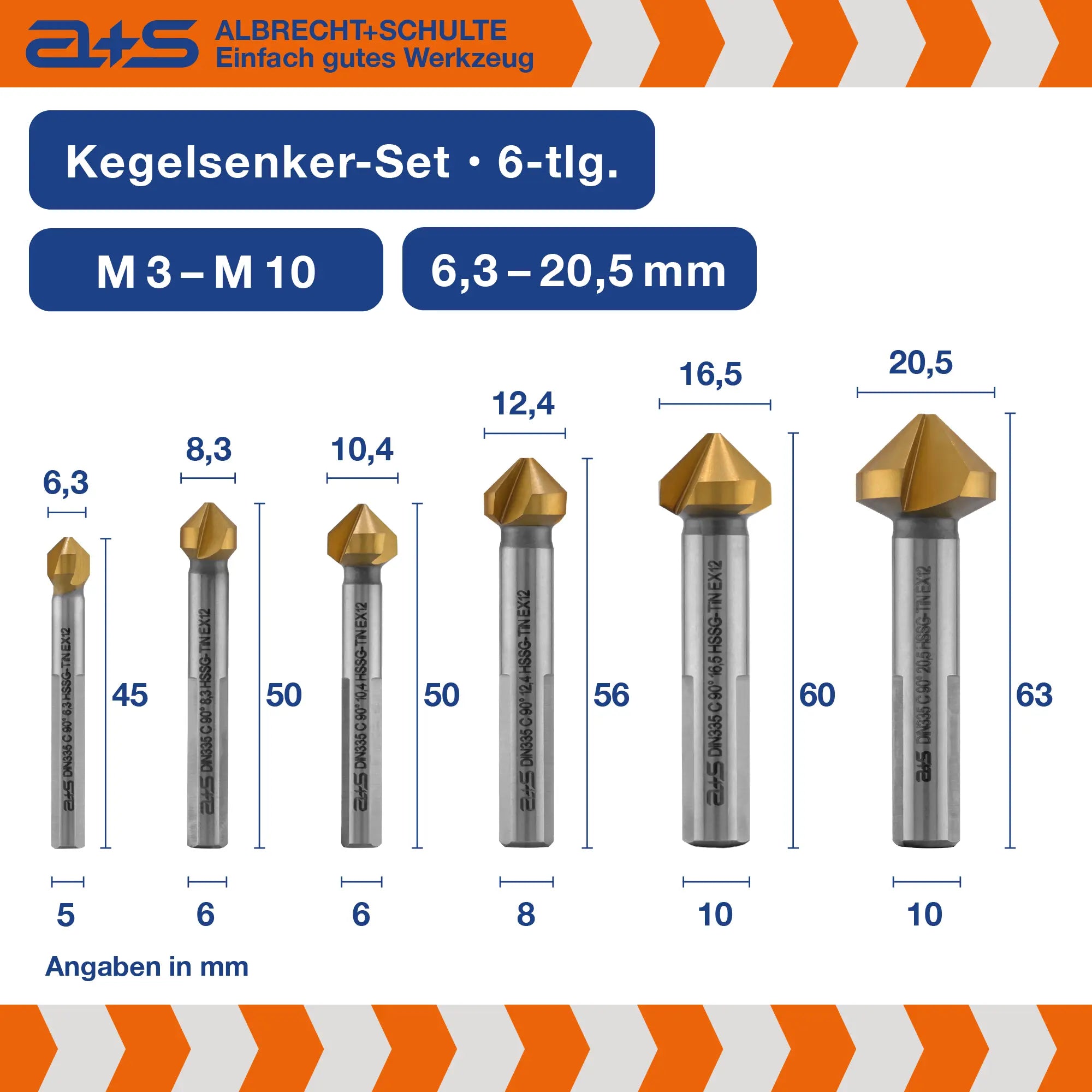 Optimale Größenabdeckung: 6 Kegelsenker von Ø 6,3 bis 20,5 mm (M3–M10).