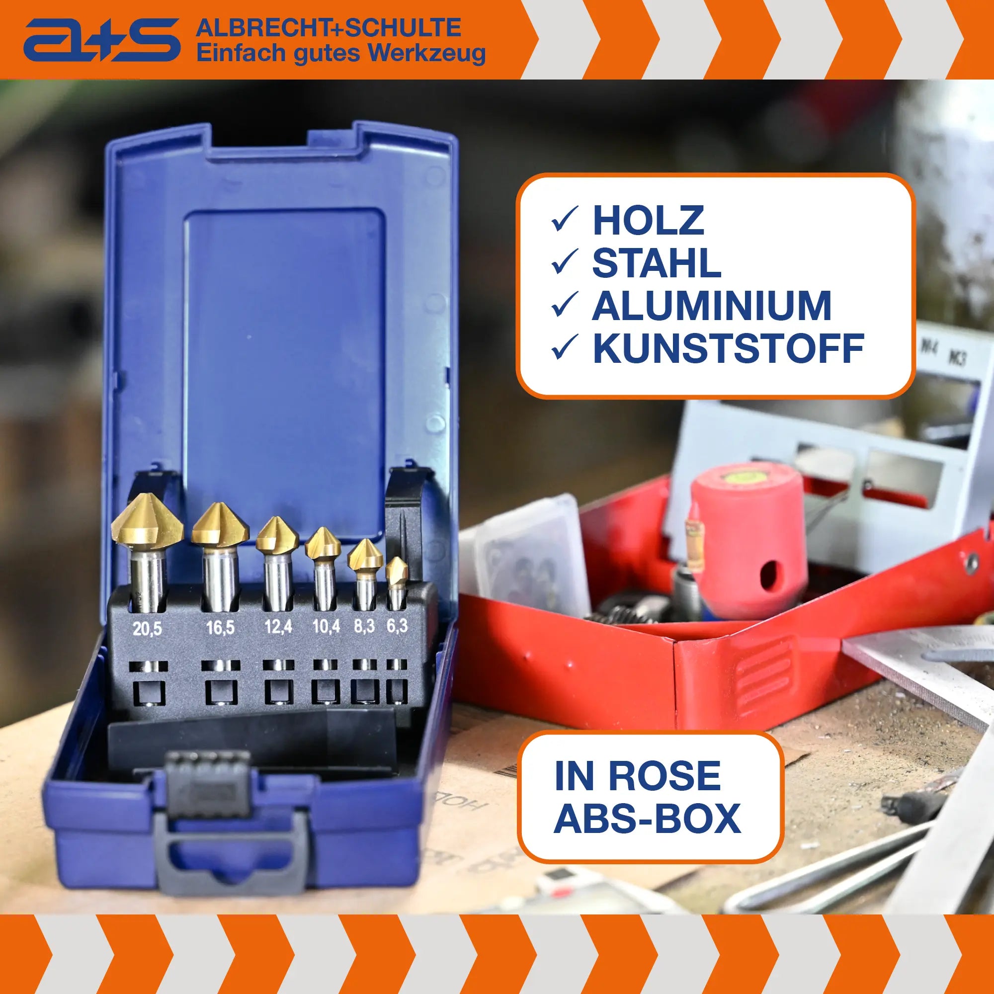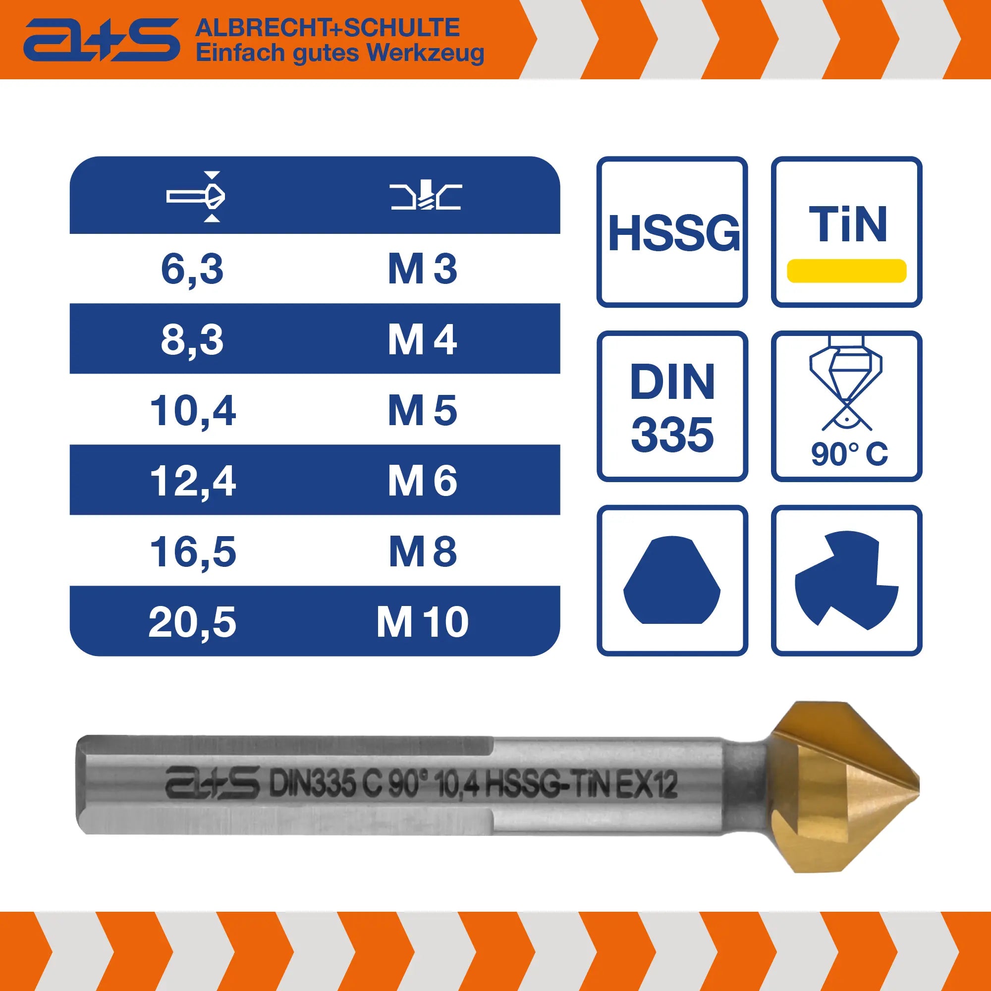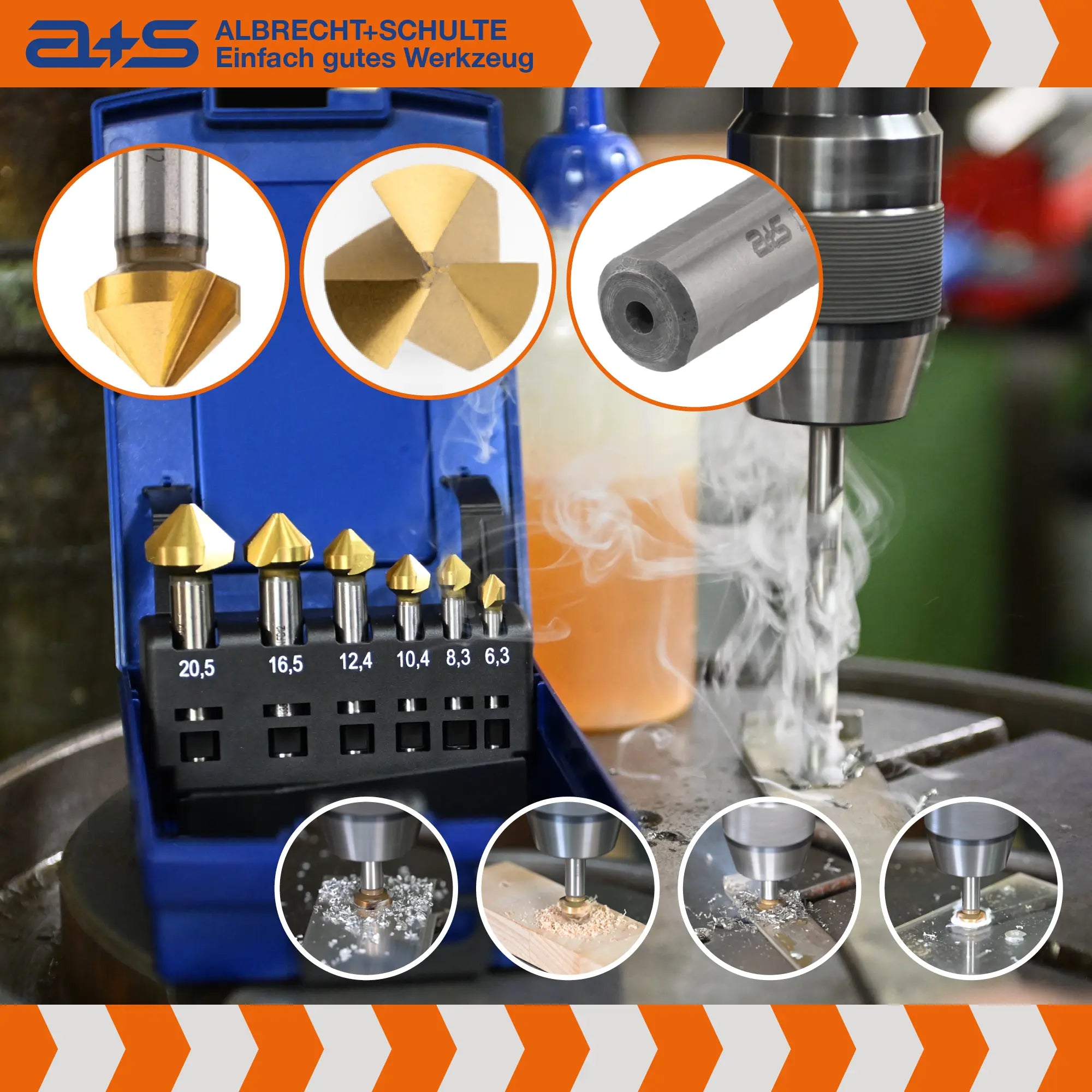 Dieses hochwertige a+s Kegelsenker-Set bietet alles, was Handwerker und Profis für gratfreie, saubere und langlebige Senkungen benötigen. Gefertigt aus präzisionsgeschliffenem HSS-G und veredelt mit einer Titan-Nitrid-Beschichtung (TiN) für maximale Standzeit und Performance.