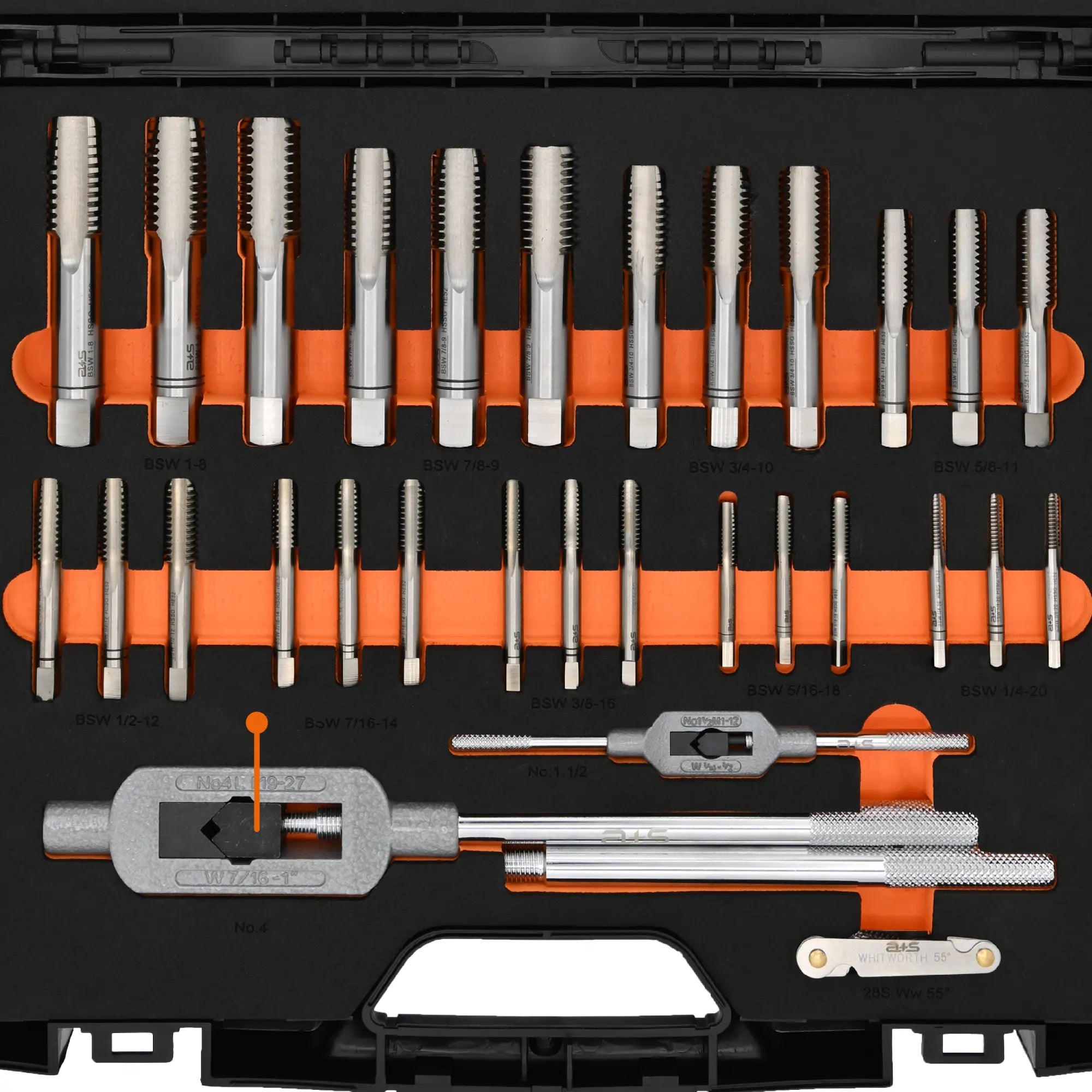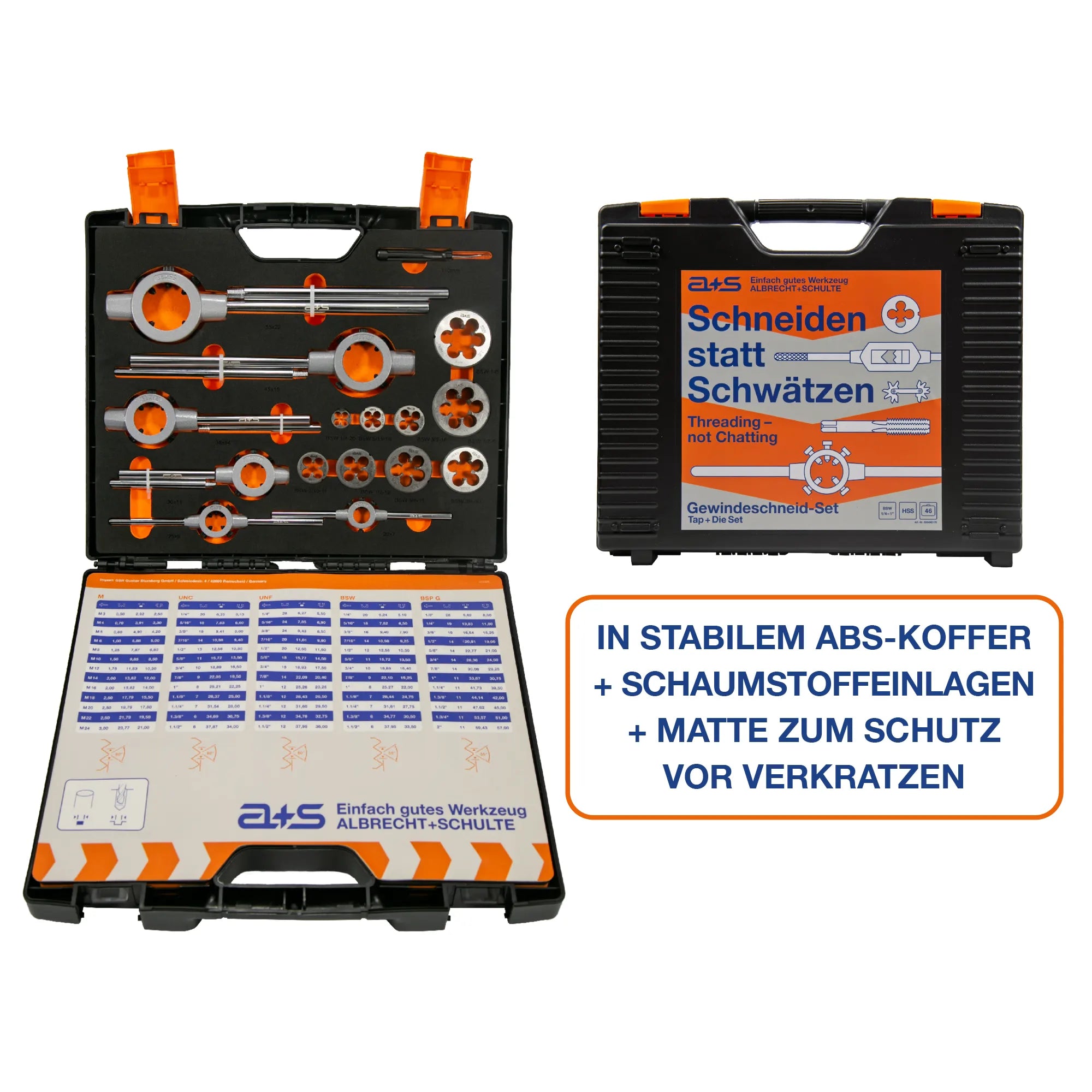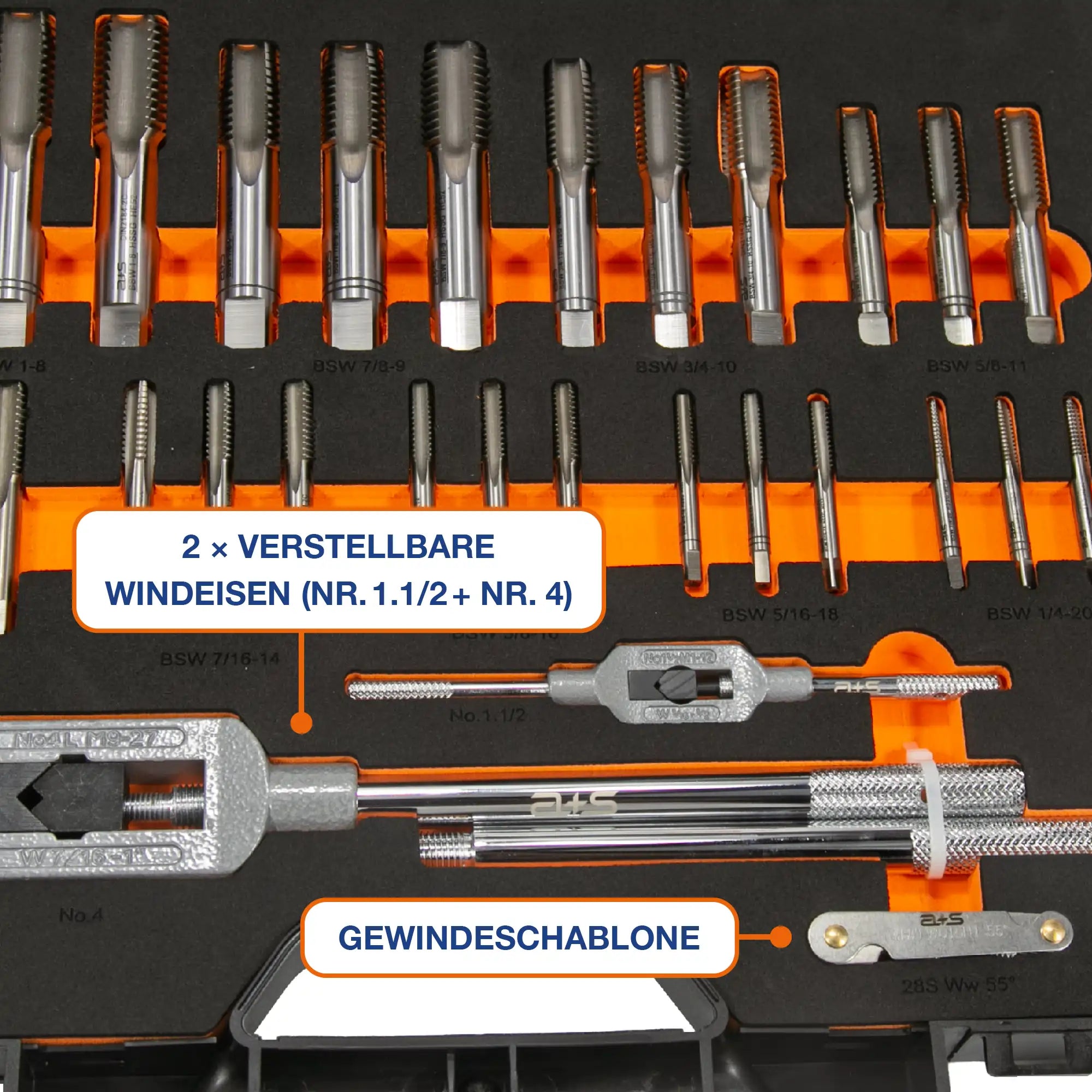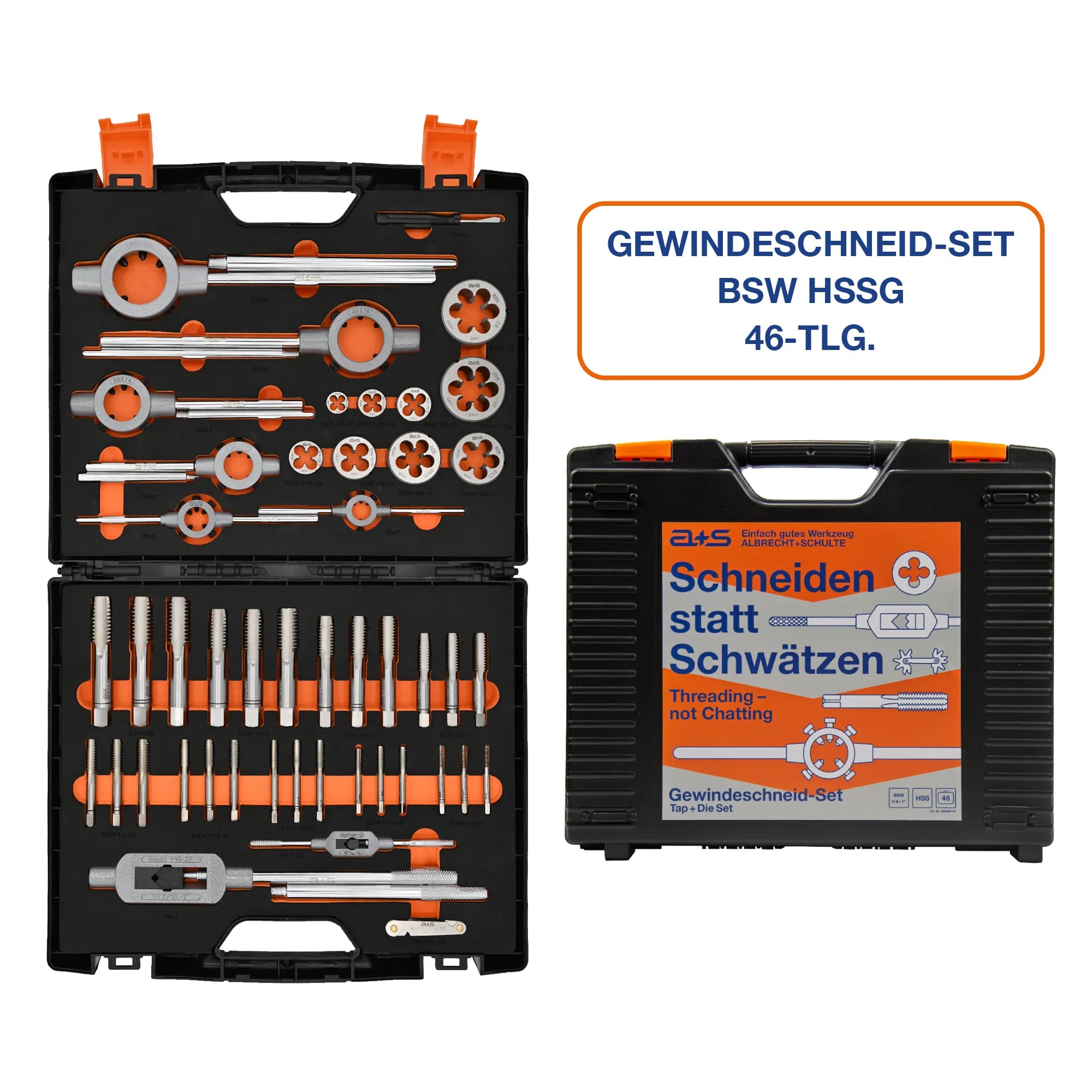 The a+s ALBRECHT+SCHULTE tap and die set S504AS170 covers all common Whitworth inch threads (BSW) from 1/4" to 1". Nine three-piece hand tap sets according to DIN 2184-2 made of HSSG and nine HSS round dies according to DIN EN 22568 Form B form the core of the set. Together with two tap wrenches, six die holders, a Whitworth thread template, and a screwdriver, it creates a complete tap and die set for British inch threads – neatly organized in a robust plastic case with EVA foam insert.