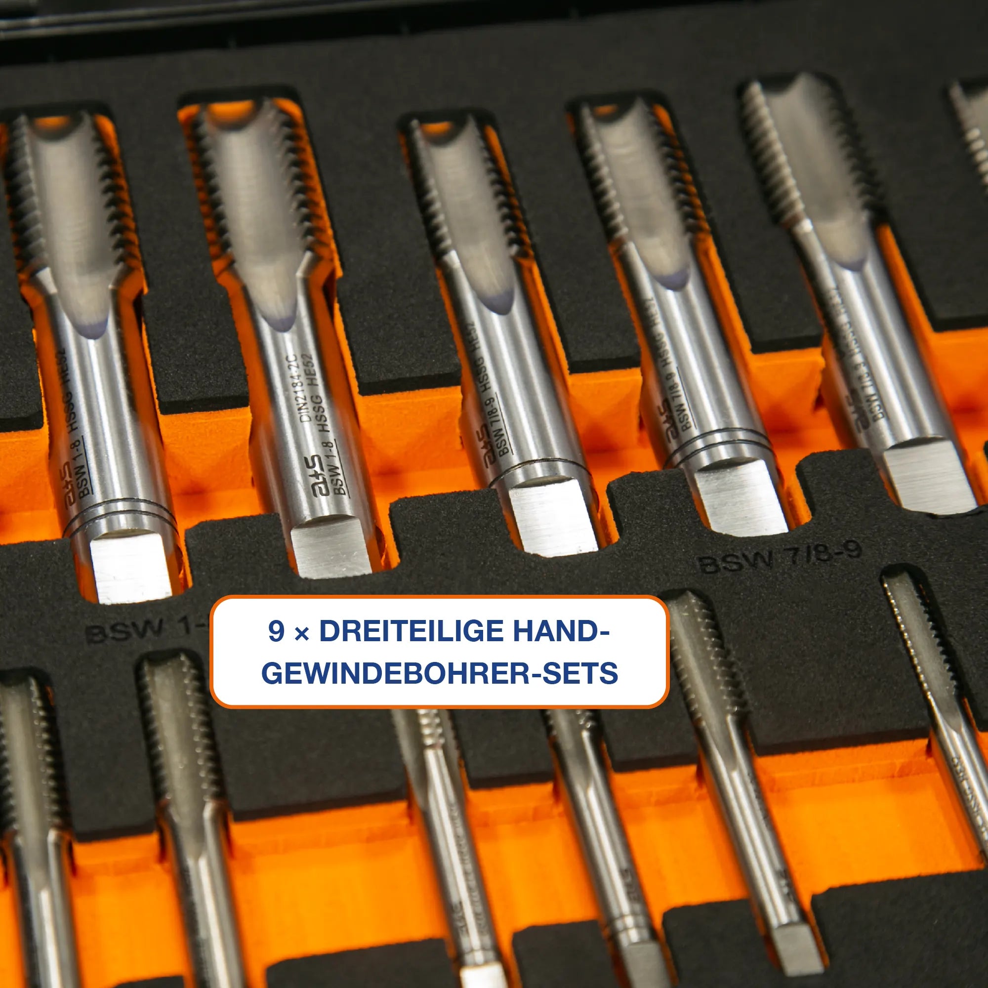 • Nine three-piece hand tap sets DIN 2184-2 HSSG for BSW 1/4''–1''