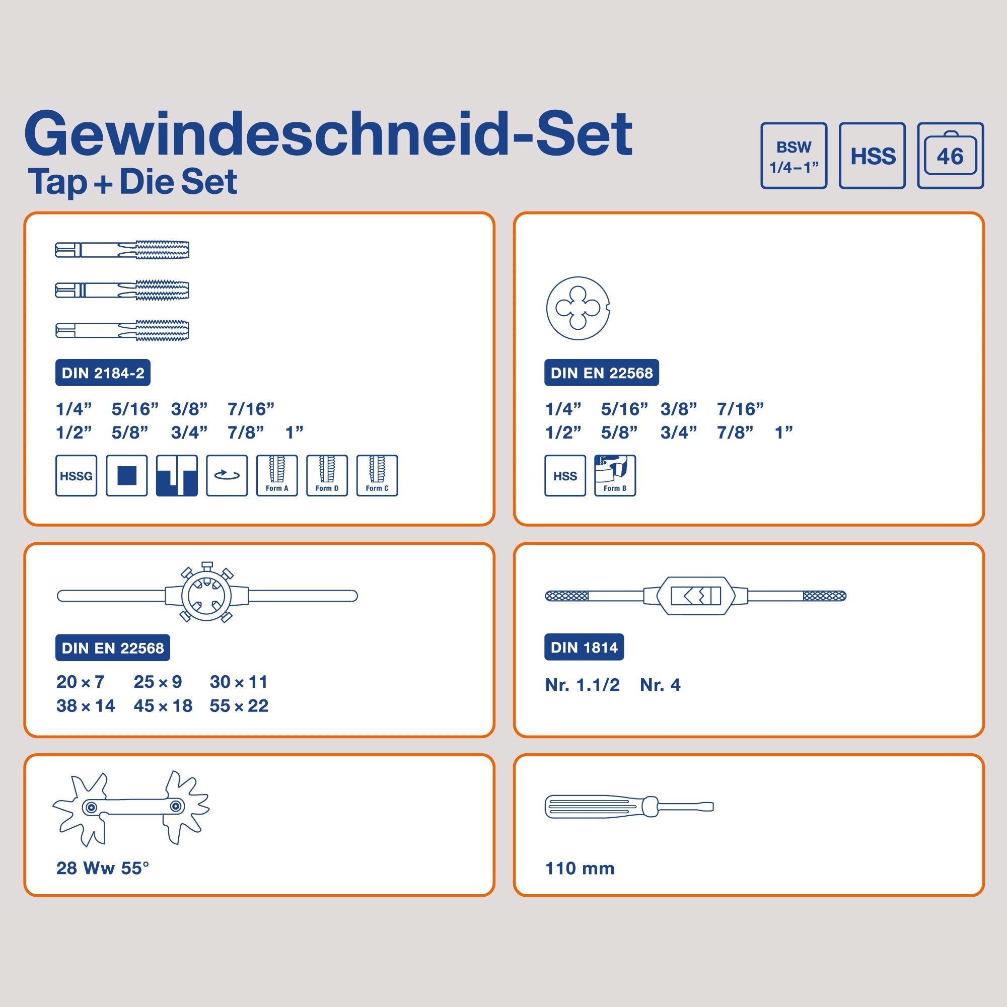 BSW Thread Cutting Set 1/4''–1'', 46-piece